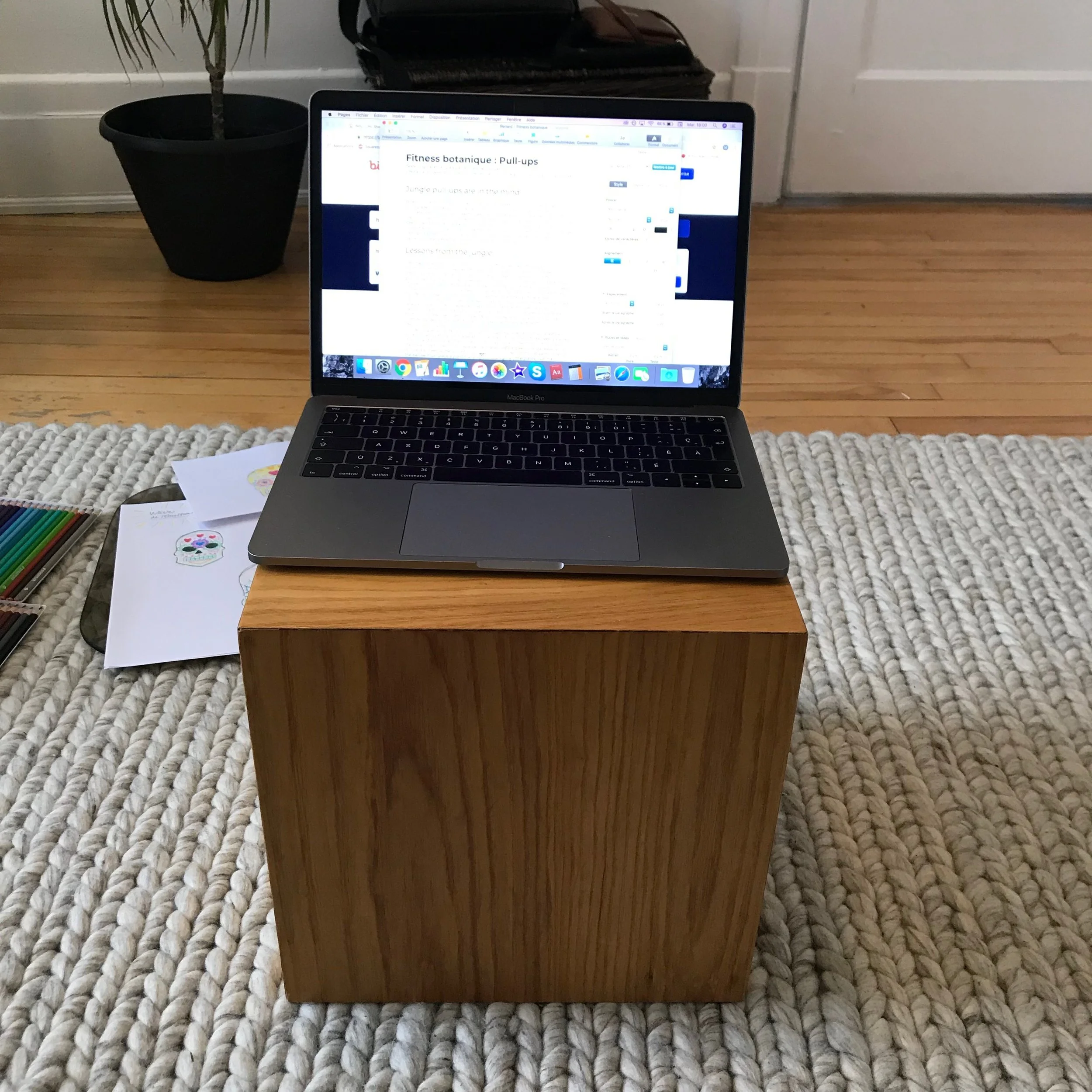 On a choisi des meubles de différentes hauteurs, comme une table haute et une table basse (c’est anciennement une table Ikea de taille régulière, dont les pattes ont été coupées). On a délaissé les chaises, mais on a tout de même un tabouret, un banc et des cubes pour s’asseoir de différentes façons.
